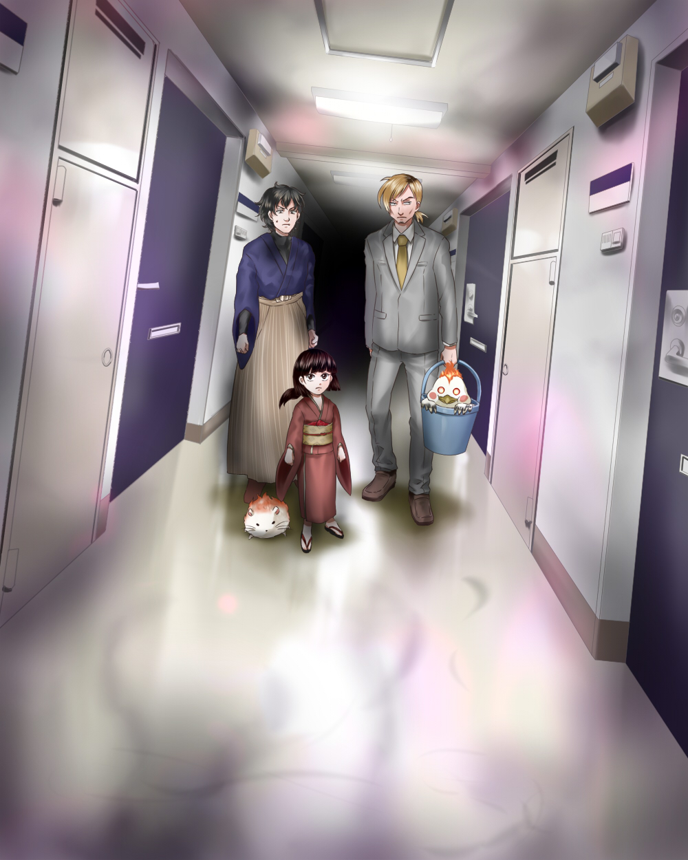 夕暮れの歩道に並んだ三つの影が、朝比奈駅から住宅街へと向かう道をゆっくり移動していく。二つは大人で、一つは小さな子供である。大人の影の一人は、癖っ毛でボサボサ頭の若い男で、年齢は二十歳くらい、ブラウンのPコートにジーンズという、ありふれた服装をしている。もう一人ははつらつとした表情と育ちの良さそうな雰囲気の女性で、男と同じ二十歳ほどの年齢である。丈の長い真っ白なコートに黒いタイトスカート、そしてスカートと同じ黒のロングブーツを履いている。そして二人の間にいる子供は、赤い着物姿で後ろ髪を結び、髪の先を筆のような形にしている娘だった。男の名は筆塚草助、女は船橋明里、そして赤い着物の娘はすずりと言い、時々こうして草助と明里が通う美術大学の帰り道を一緒に歩くことがあった。明里が草助の描く絵の雰囲気に目を留めた事がきっかけで二人は知り合い、今では昼食や帰り道を一緒にするくらいに仲良くなったものの、明里は草助が人知れず妖怪退治の仕事をしていることを知らず、すずりが妖怪を封じる筆の化身であることも当然知らなかった。実際には明里自身、妖怪の起こした事件に巻き込まれて襲われたことがあり、さらには彼女の自宅で飼われているハナビという名のネズミも、正体は火鼠という希少な妖怪なのだが、草助は彼女にその事実を伝えずにいた。無論それは、明里を危険な目に遭わせまいとする気遣いからだったのだが。